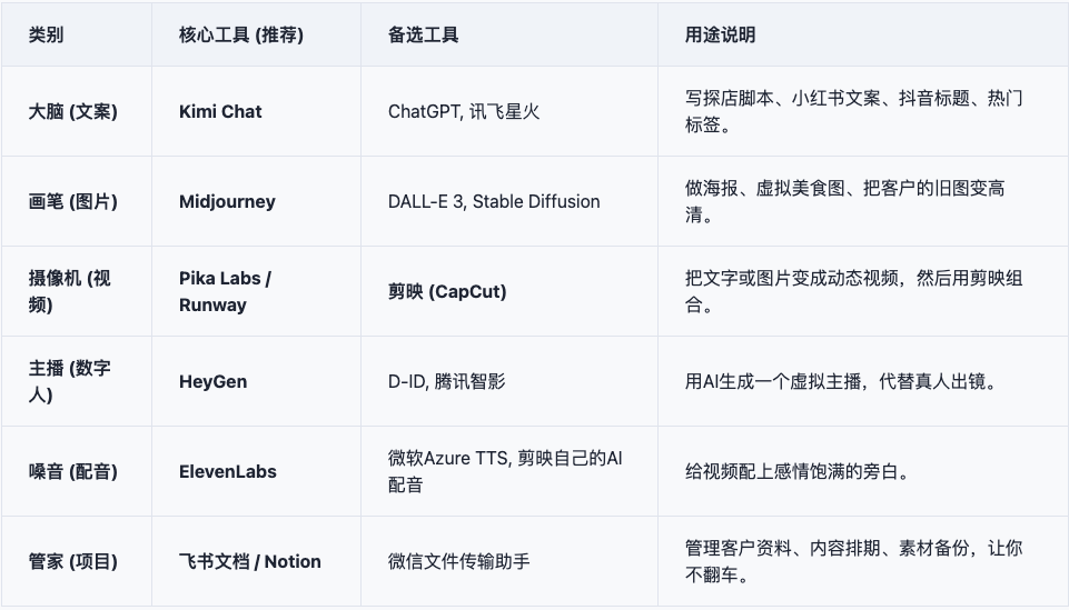 B. 短视频制作流程 (核心技能!): 选定脚本,用ElevenLabs或剪映生成配音,用Pika或Runway生成AI视频片段,最后在剪映中进行剪辑、添加字幕和BGM。