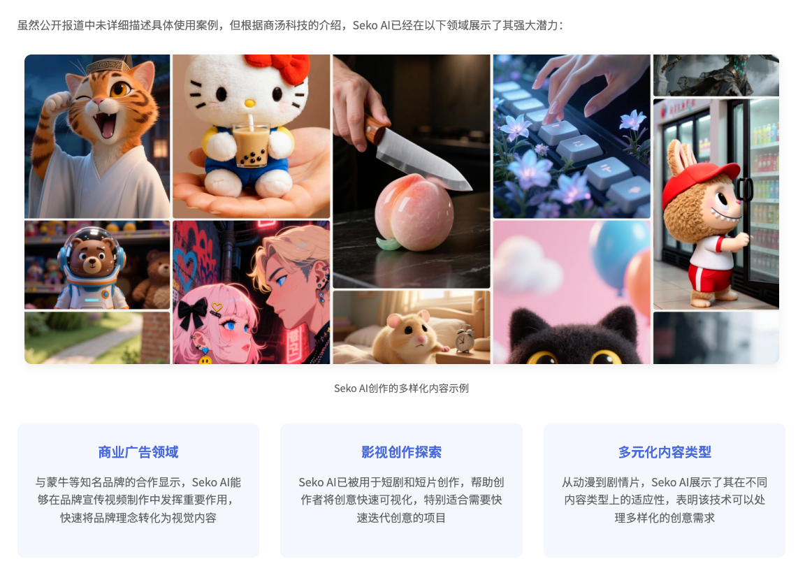 虽然公开报道中未详细描述具体使用案例,但根据商汤科技的介绍,Seko AI已经在以下领域展示了其强大潜力: