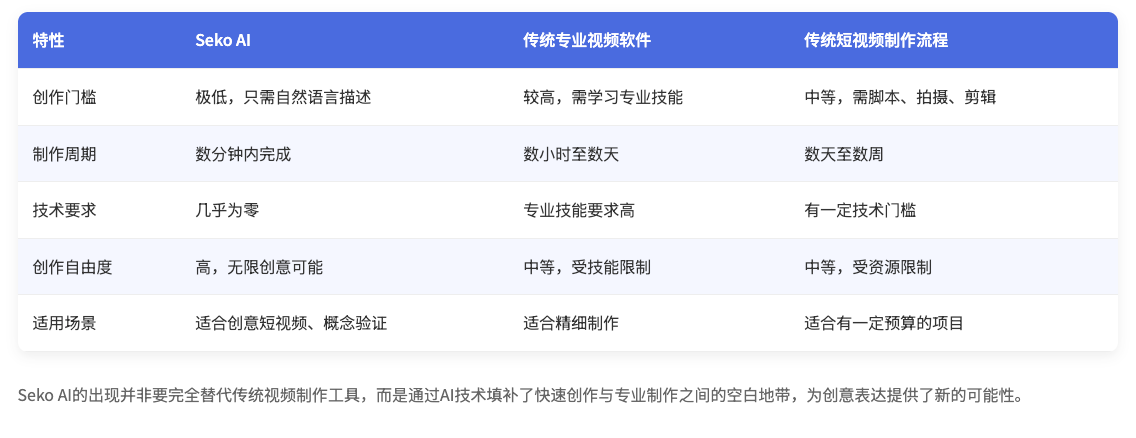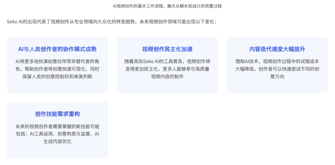 在可预见的未来,AI与人类创作者的协作模式将逐渐成熟,视频创作的门槛将进一步降低,内容迭代速度将大幅提升,最终受益的将是整个数字内容生态和消费者。Seko AI不仅是一个工具的创新,更是视频创作范式的一次重要变革。